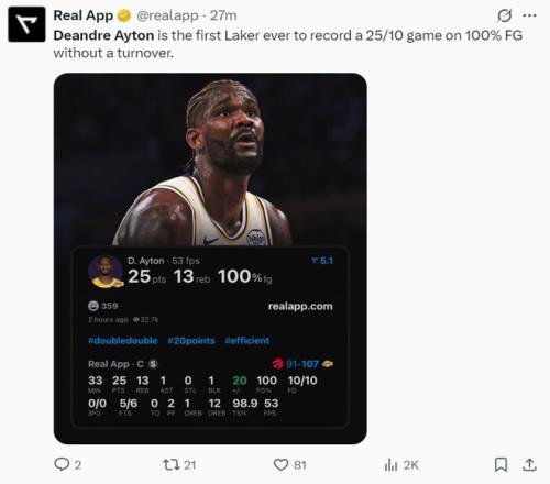 这场比赛后艾顿创造了多项纪录:1.艾顿成为湖人队史首位100%+25+10+0失误的球员;